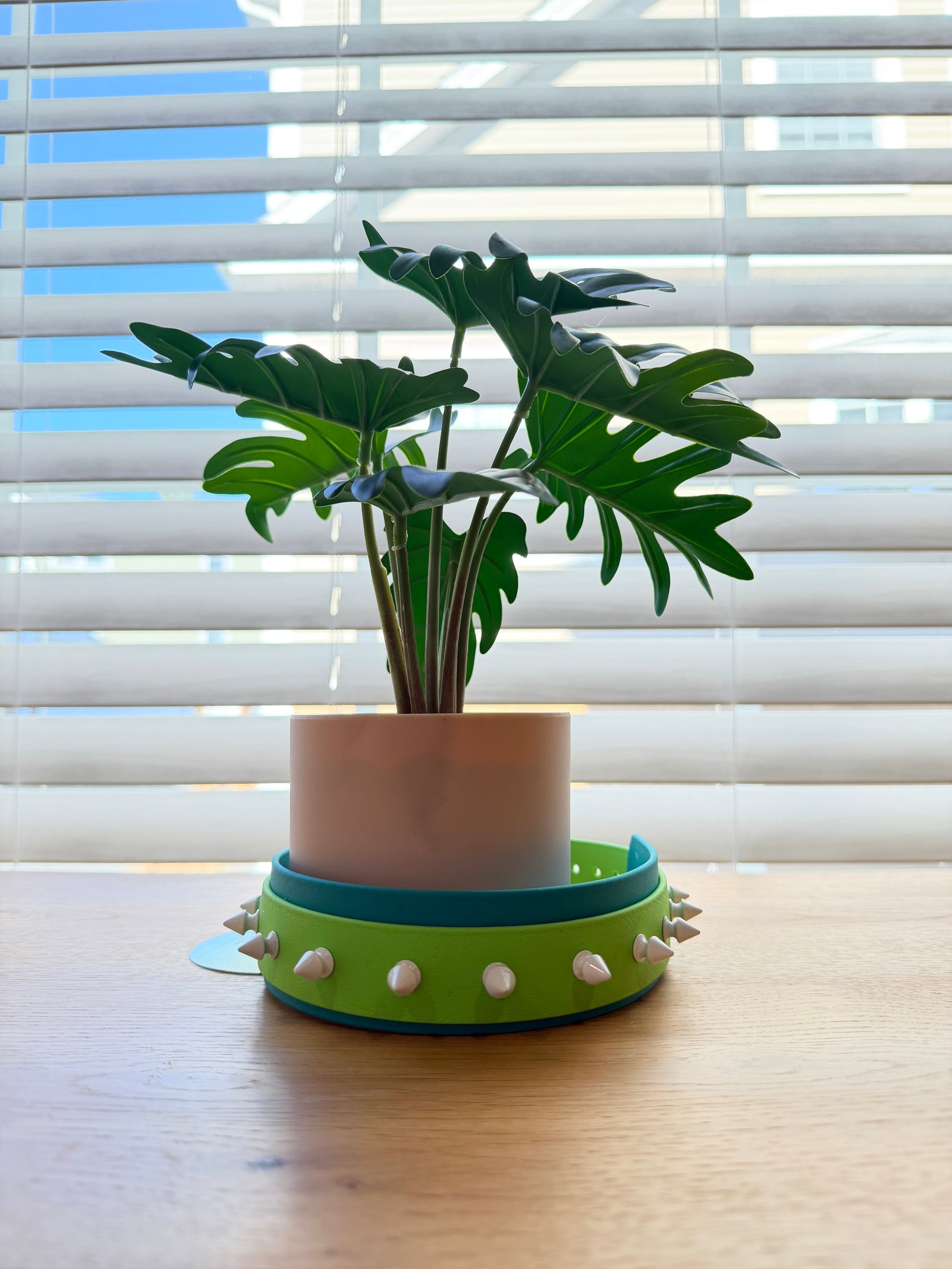 This bold, handcrafted spike collar features a durable 1.5-inch turquoise Biothane backing paired with a 1-inch apple green top layer for a clean, modern look. Designed for dogs who need both style and function, this collar is waterproof, easy to clean, and built to last.